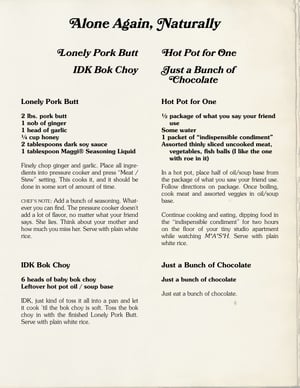Cleaning out her mother's house, Trina found a collaged cookbook of her mother's from the early 1980s, collecting recipes and what Trina calls "a blueprint for the start of her family." In Do It Yourself, using that cookbook as a starting place, Trina reassembles the improvised meals of her own adulthood, and art directs them with the same eye-watering sense of excess that one finds in the Good Housekeeping cookbooks of the late '70s. The recipes' instructions reflect the struggles and heartbreak in her own life, contrasting them with those of her mother's thirty years earlier. Both experiences are tied together with Trina's oversaturated, perfectly staged photographs of her own creations. The result is an examination of memory, loneliness, depression and family that is both very funny and deeply affecting.